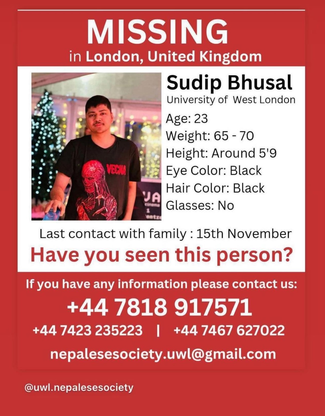 लन्डन । लन्डनस्थित ‘युनिभर्सिटी अफ वेष्ट लन्डन’ मा अध्ययनरत २३ वर्षीय नेपाली विद्यार्थी सुदीप भुषाल सम्पर्कविहीन भएका छन् ।