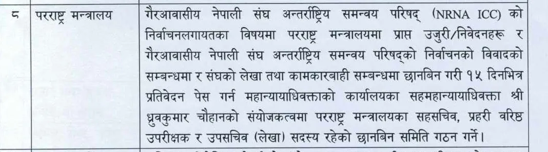 गैरआवासीय नेपाली संघको उच्चस्रोतका अनुसार निर्वाचित कार्यसमितिमाथि छानविन गर्न नैतिक वा कानुनी आधार नभएको भन्दै मन्त्रालयद्धारा प्रस्तावित सदस्यहरु समितिमा बस्न अस्वीकार गरेका थिए ।