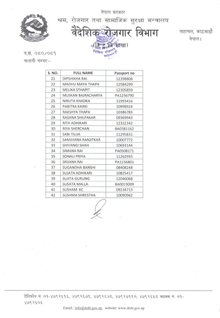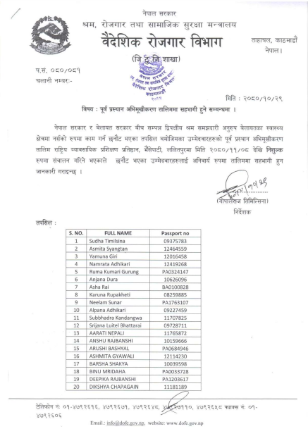 बाँकी तीन जनाले ड्रप आउट गरेपछि ४२ जनाको मात्रै नाम सार्वजनिक गरिएको विभागले जनाएको छ । उनीहरूलाई फागुन ११ गतेदेखि निःशुल्क रूपमा पूर्व प्रस्थान अभिमुखीकरण तालिम दिइनेछ । त्यसका लागि भैसेपाटीस्थित राष्ट्रिय व्यावसायिक प्रशिक्षण प्रतिष्ठानमा सम्पर्क गर्न विभागले आग्रह गरेको छ ।