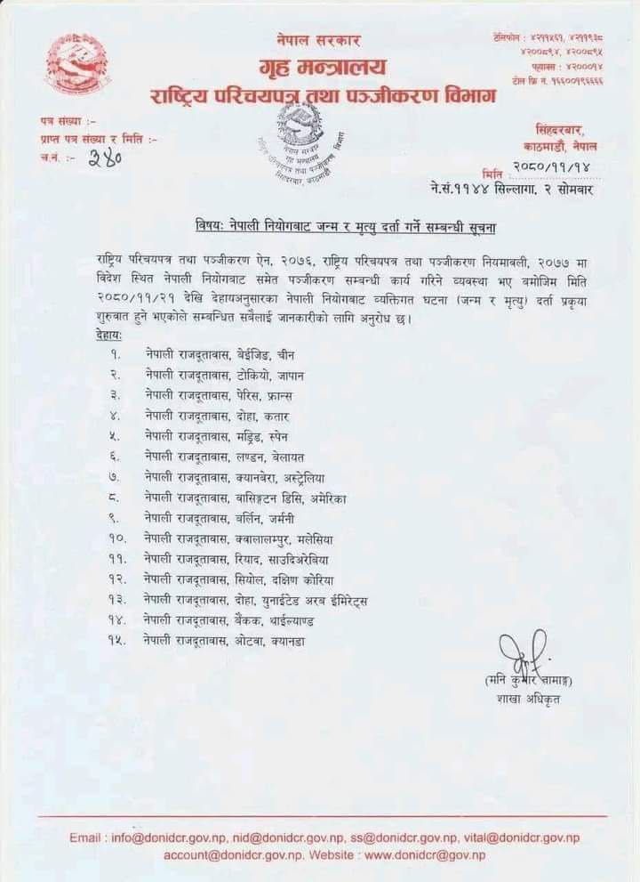 राष्ट्रिय परिचयपत्र तथा पंन्जीकरण ऐन २०७६, राष्ट्रिय परिचय तथा पंन्जीकरण नियमावली २०७७ मा विदेशस्थित नेपाली नियोगबाट समेत जन्म र मृत्यु दर्ता गर्ने व्यवस्था अनुसार नेपाल सरकारले नयाँ व्यवस्था गरेको हो ।