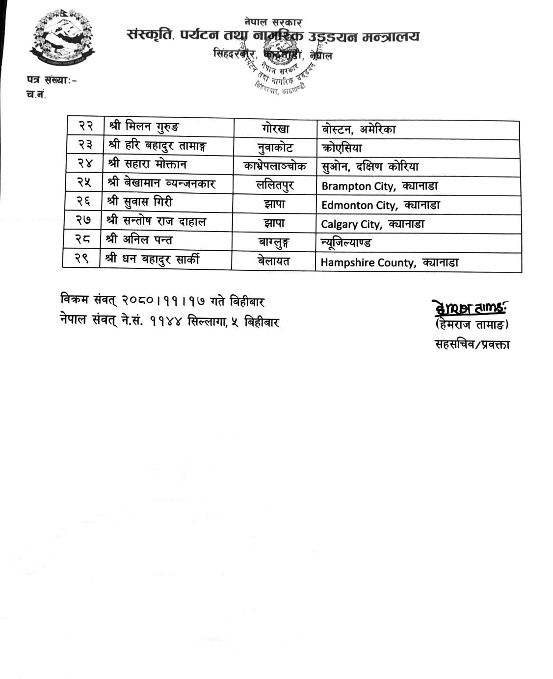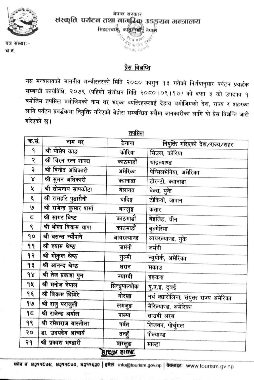 विगतमा विभिन्न मुलुकमा नियुक्त गरिने पर्यटन दूतलाई मन्त्रीस्तरिय निर्णय गर्दै मन्त्रालयले यस वर्षदेखि पर्यटक प्रवर्द्धकको रूपमा नियुक्त गरेको हो ।