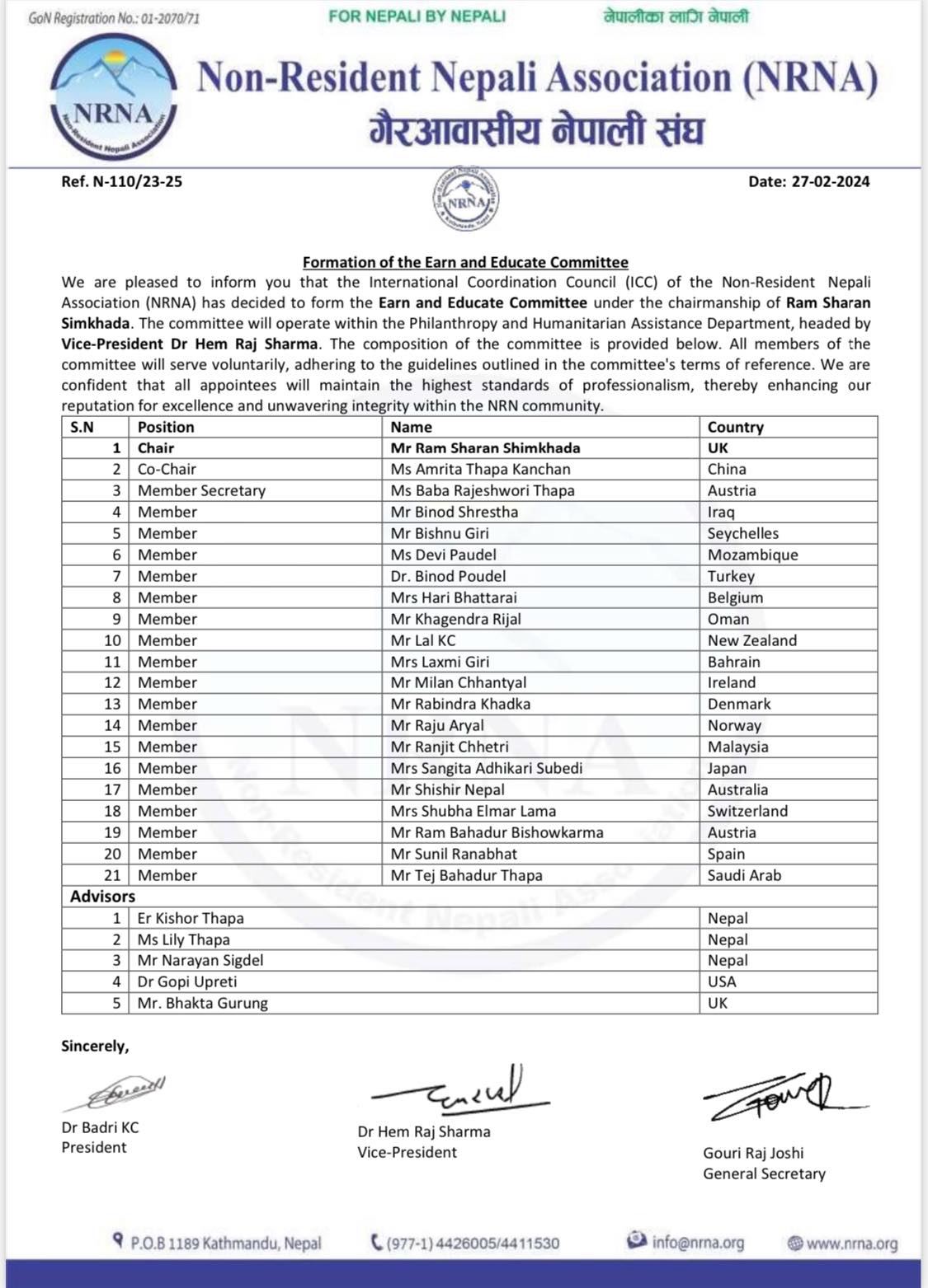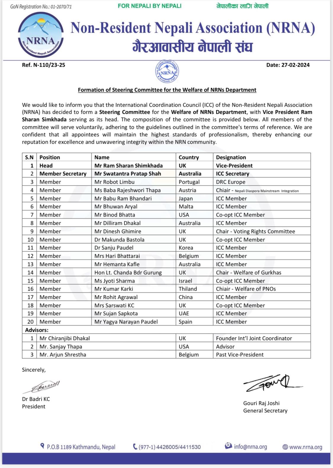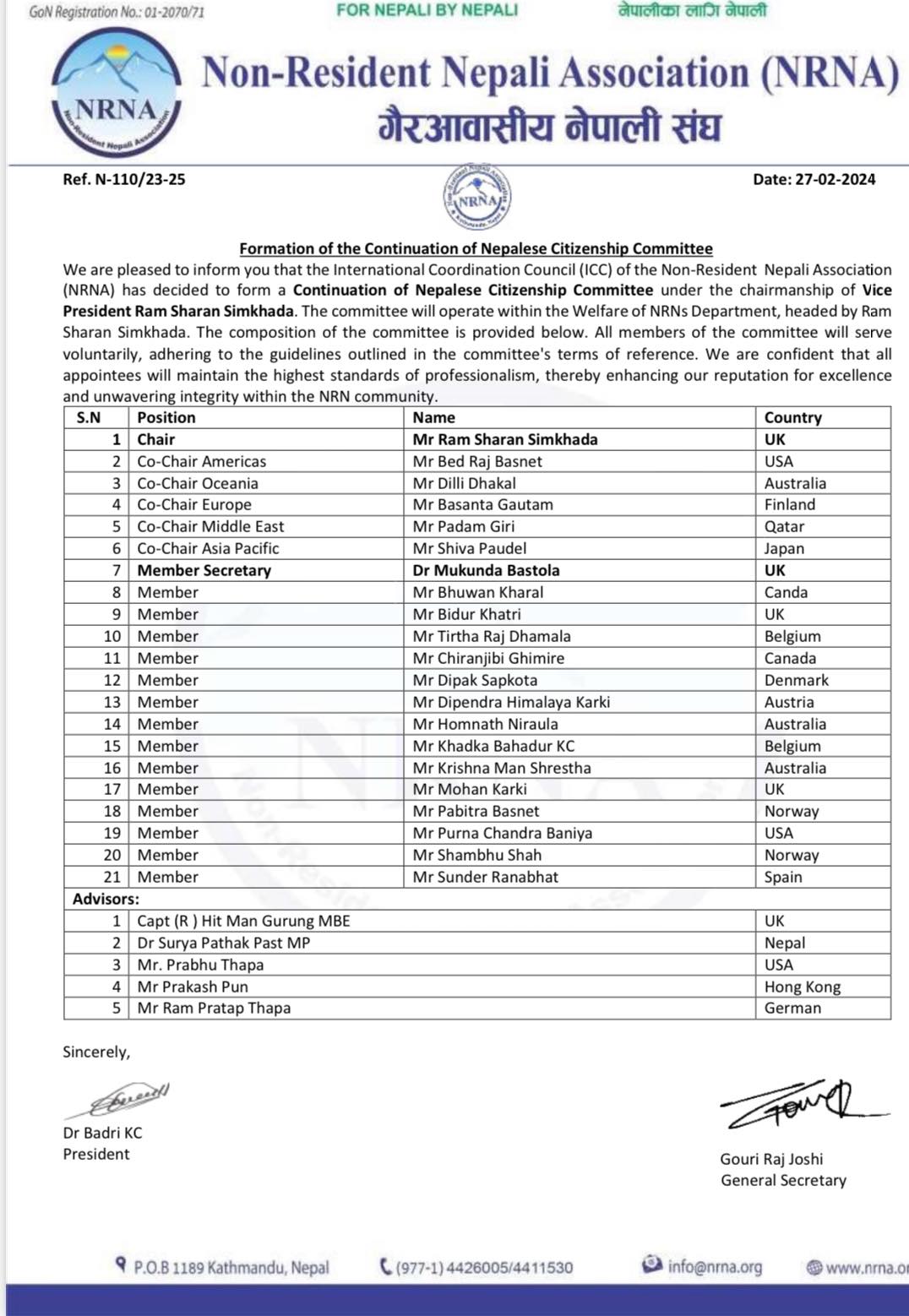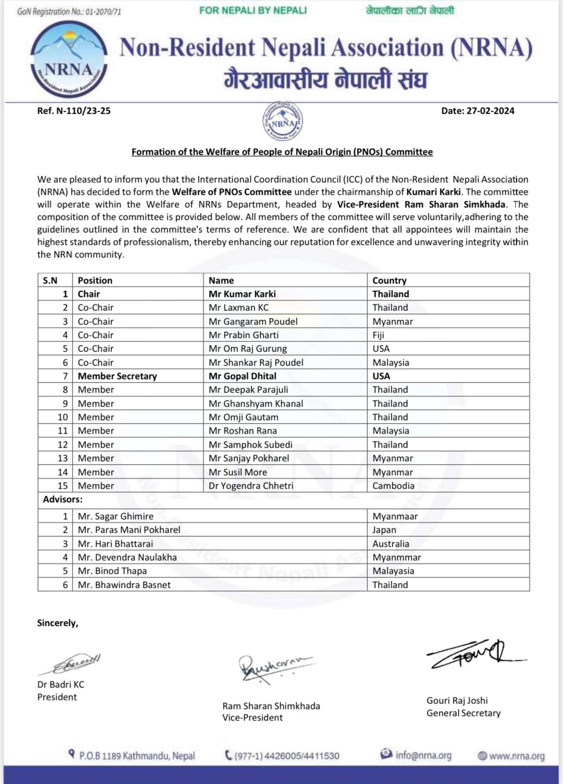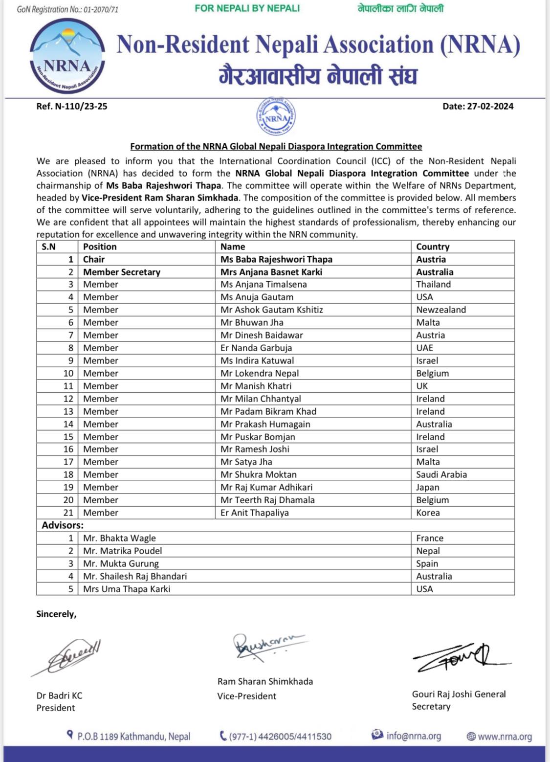 संघका अनुसार नागरिकताको निरन्तरताको संयोजकमा रामशरण सिमखडा, भूपूगोर्खाको संयोजकमा चन्द्र बहादुर गुरुङ, पिएनओको संयोजकमा कुमार कार्की, नेपाली डायसपोरा इन्ट्रिगेशन समितिमा बाबा राजेश्वरी थापा रहेकी छन् ।