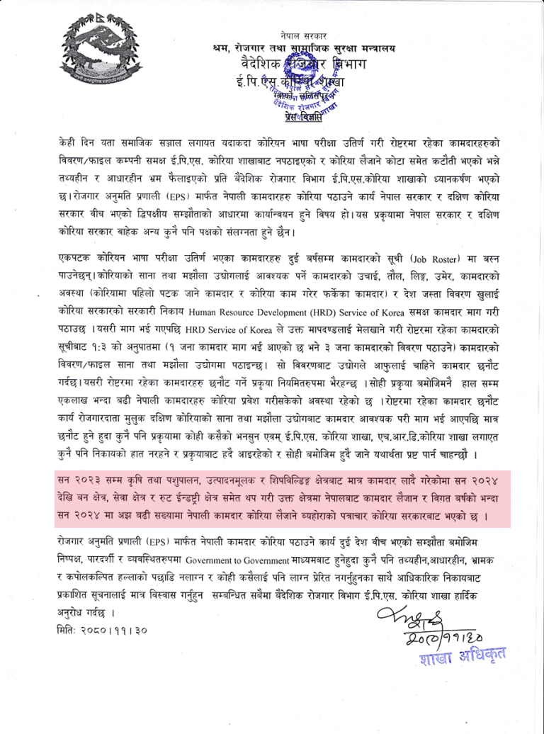 वैदेशिक रोजगार विभागका महानिर्देशक डन्डुराज घिमिरेका अनुसार भाषा परीक्षामा पास भएका र फर्किएर आएपछि कोरिया जान फेरि परीक्षा पास गरेकाहरूलाई थप अवसर दिने गरी कोरियाले थप ३ क्षेत्रमा पनि श्रमिक लैजाने जानकारी दिएको हो ।