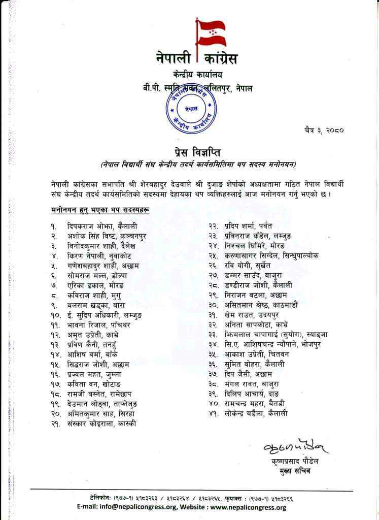 कांग्रेस सभापति शेरबहादुर देउवाले दुजाङ शेर्पाको अध्यक्षतामा गठित नेविसंघको केन्द्रीय तदर्थ समितिमा विभिन्न जिल्लाका गरी ४१ जना थप गरेका कांग्रेस पार्टी कार्यालयका मुख्य सचिव कृष्णप्रसाद पौडेलले जानकारी दिए।
