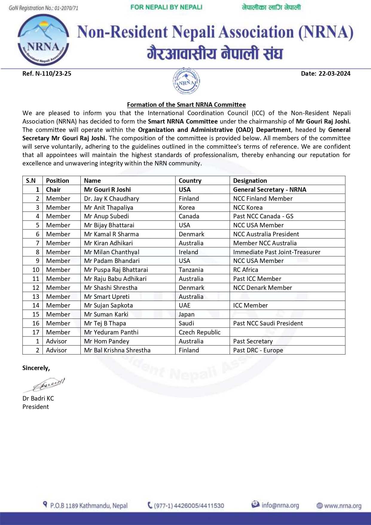 लण्डन । गैरआवासीय नेपाली संघ (एनआरएनए) को स्मार्ट एनआरएनए कार्यदलको विस्तार गरिएको छ । संघका महासचिव गौरीराज जोशीको संयोजकत्वमा गठित समिति १७ सदस्यसीय रहेको छ । समितिको सल्लाहकारमा होम पाण्डे र बालकृष्ण श्रेष्ठ रहेका छन् ।