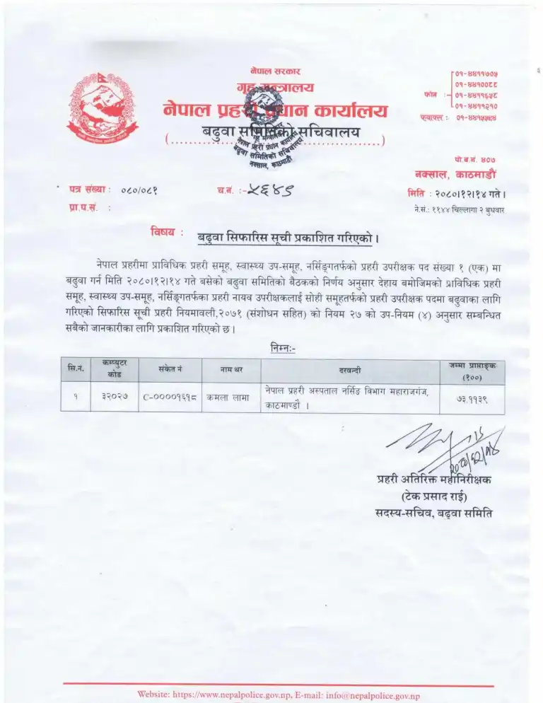 यसैगरी प्राविधिक प्रहरी समूह, स्वास्थ्य उपसमूह, नर्सिङतर्फको प्रहरी उपरीक्षकमा नेपाल प्रहरी अस्पताल नर्सिङ विभाग महाराजगन्जमा कार्यरत कमला लामाको बढुवा भएको हो ।