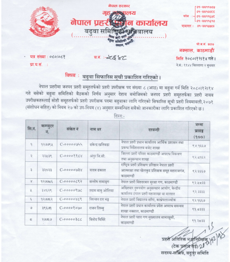 प्रहरी प्रधान कार्यालयमा बुधबार बसेको बढुवा समितिको बैठकले जनपद प्रहरी समूहतर्फ ८ र प्राविधिक प्रहरी समूह, स्वास्थ्य उप-समूह, नर्सिङतर्फ एक गरी नौ जना डिएसपीलाई एसपीमा बढुवाका लागि सिफारिस गरेको हो ।