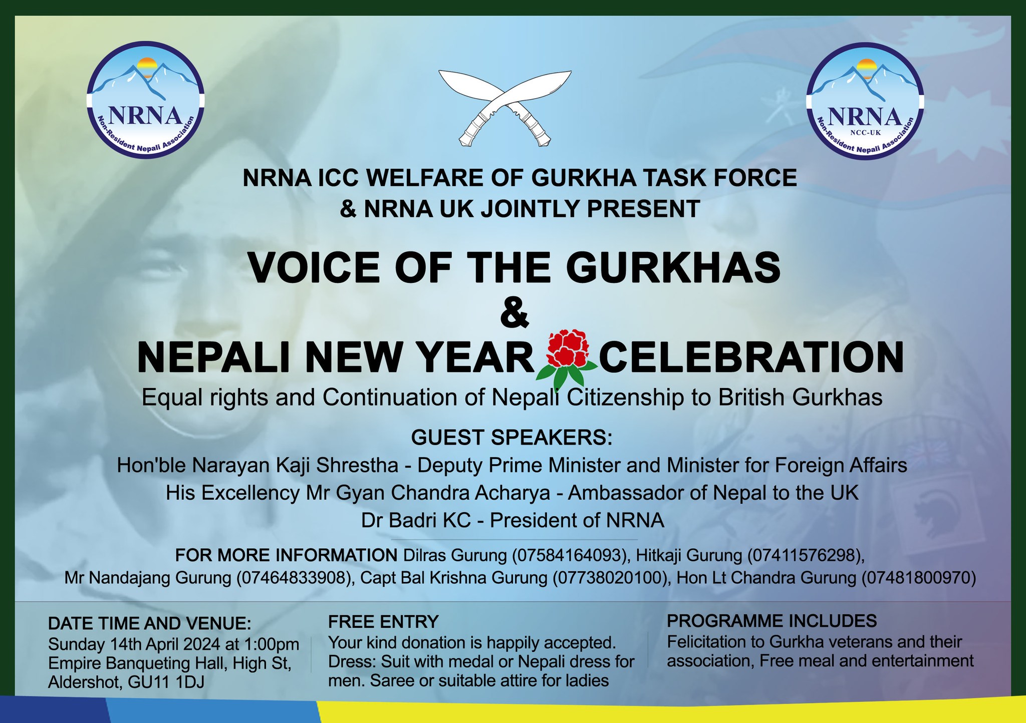 गैरआवासीय नेपाली संघको वेल्फेर अफ गोर्खा विभागका संयोजक चन्द्र गुरुङका अनुसार दशकौ देखि न्यायको पक्षमा लडिरहेका गोर्खा योद्धाहरुको उच्च समानको लागि सो कार्यक्रमको आयोजना गर्न लागिएको हो ।