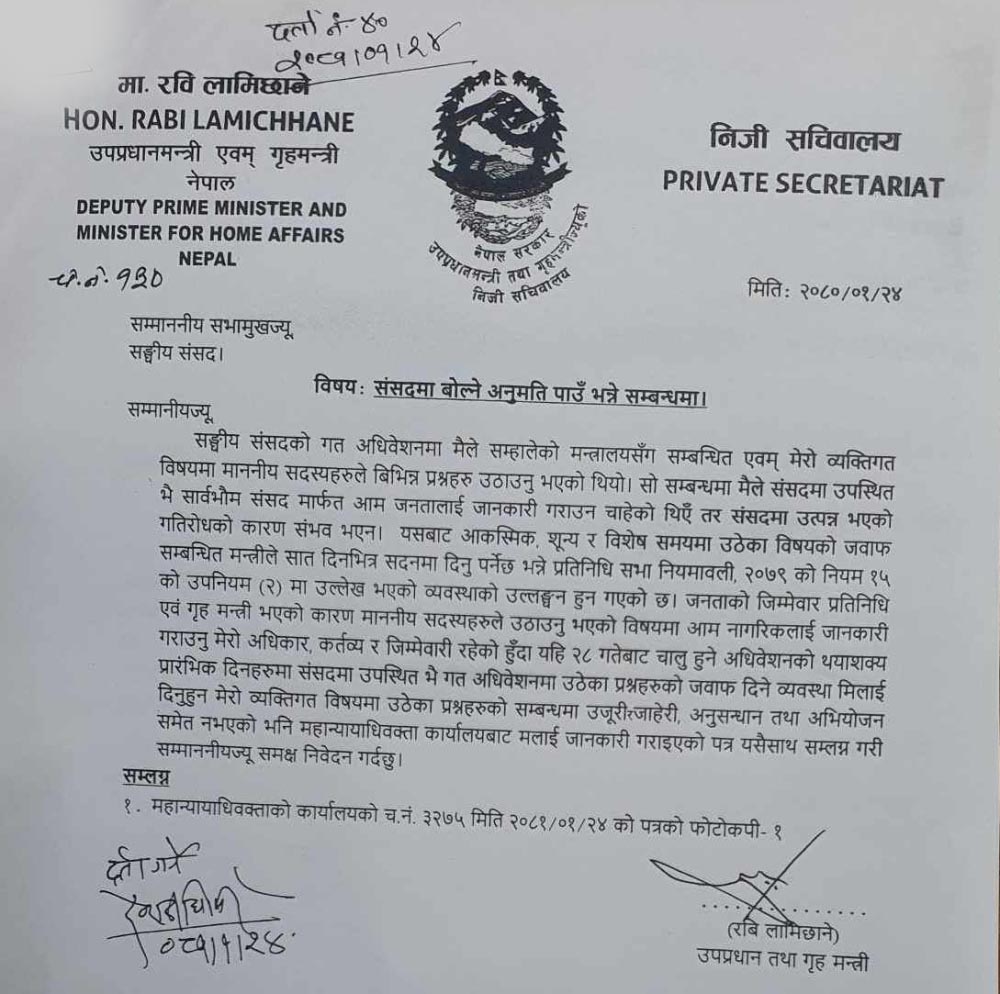 काठमाडौँ । उपप्रधान तथा गृहमन्त्री रवि लामिछानेले संसद्मा बोल्न अनुमति माग्दै सभामुख देवराज घिमिरेलाई पत्र पठाएका छन् ।