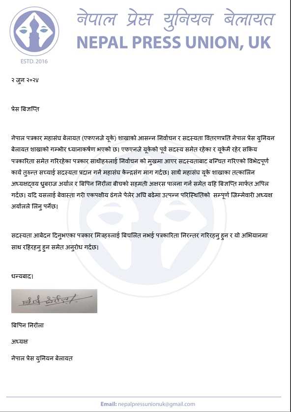 युनियनका अध्यक्ष विपिन निरौलाले आइतवार एक विज्ञप्ति जारी गर्दै नेपाल पत्रकार महासंघ बेलायत (एफएनजे यूके) शाखाको आसन्न निर्वाचन र सदस्यता वितरणप्रति नेपाल प्रेस युनियन बेलायत शाखाको गम्भीर ध्यानाकर्षण भएको जनाएको छ ।