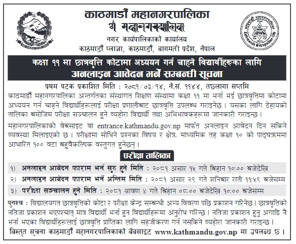 काठमाडौँ । काठमाडौँ महानगरपालिकाले संस्थागत शिक्षण संस्थामा कक्षा ११ मा भर्ना भई छात्रवृत्तिमा अध्ययन गर्न चाहने विद्यार्थीलाई आवेदन दिन आग्रह गरेको छ।