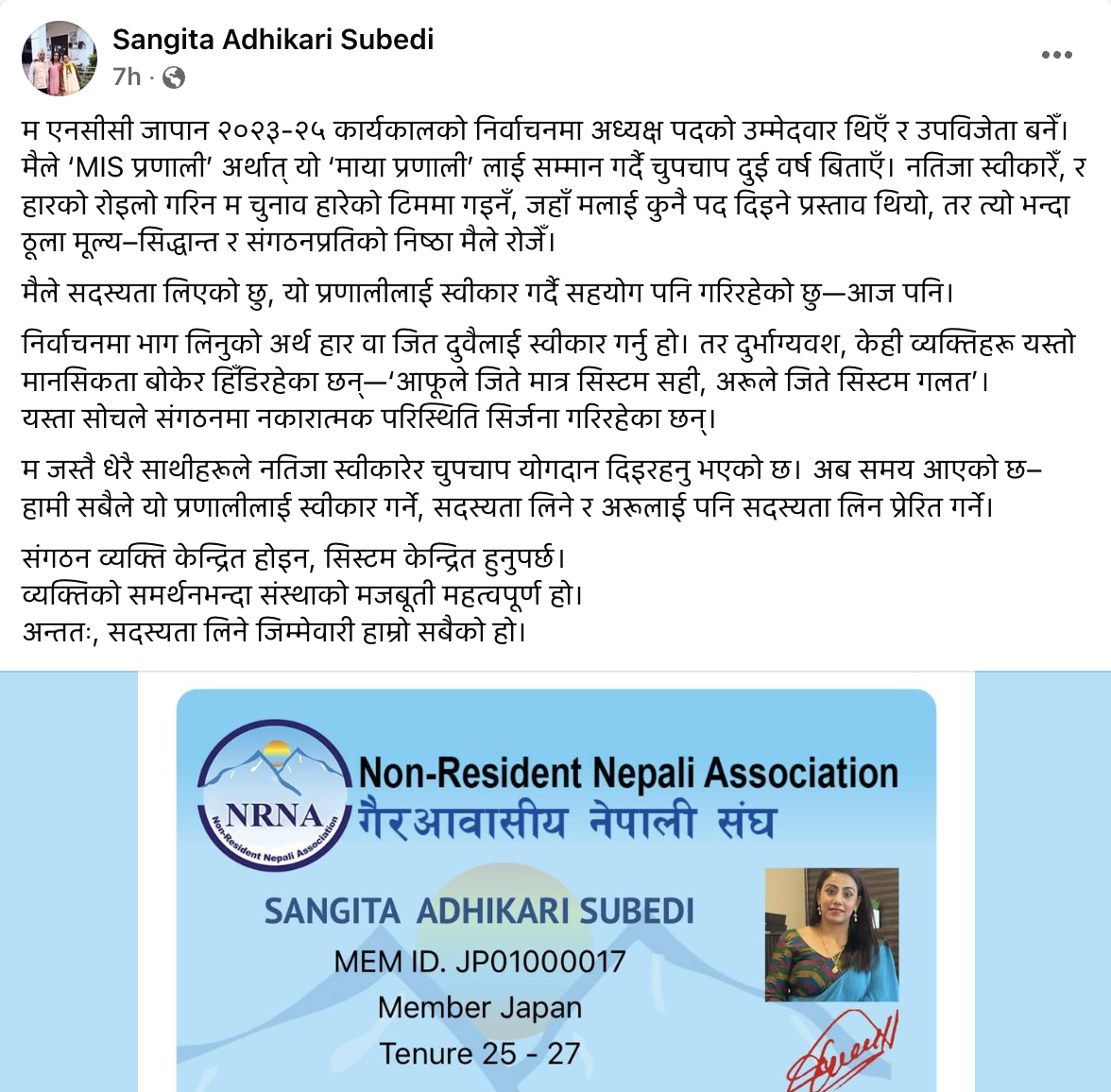 टोकियो— गैरआवासीय नेपाली संघ (एनआरएनए) जापानकी सक्रिय अभियन्ता संगिता अधिकारी सुवेदीले संघभित्र प्रणालीको सम्मान र संस्थागत मूल्यको संरक्षण अपरिहार्य रहेको बताएकी छन्।