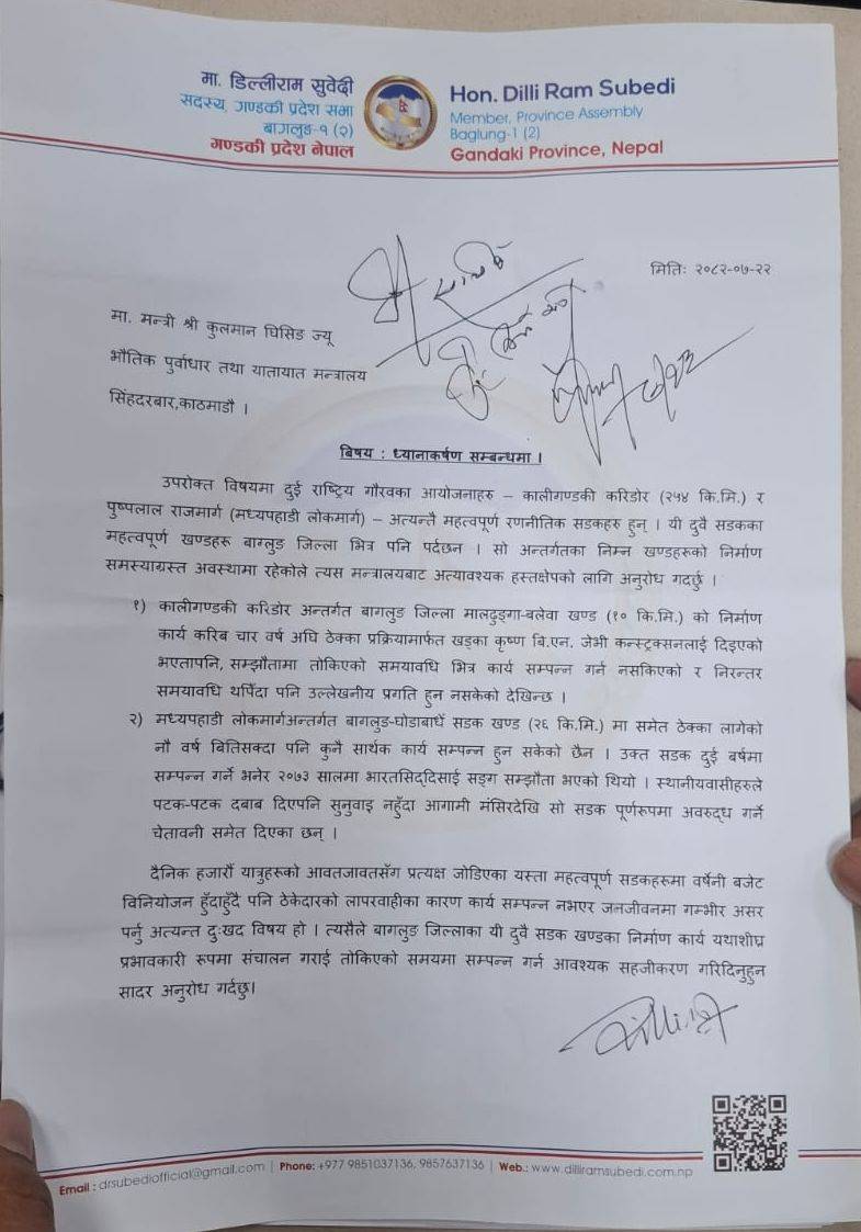 कालीगण्डकी करिडोर निर्माण कार्य करिब चार वर्ष अघि ठेक्का प्रक्रियामार्फत खड्का कृष्ण बि.एन. जेभी कन्स्ट्रक्सनलाई दिइएको भएतापनि, सम्झौतामा तोकिएको समयावधि भित्र कार्य सम्पन्न गर्न नसकिएको र निरन्तर समयावधि थपिँदा पनि उल्लेखनीय प्रगति हुन नसकेको बताईएको छ । लोकमार्गको बागलुङ– विहुँ खण्डमा पनि ठेक्का लागेको नौ वर्ष बितिसक्दा पनि कुनै सार्थक कार्य सम्पन्न हुन नसकेको र उक्त सडक दुई बर्षमा सम्पन्न गर्ने भनेर २०७३ सालमा आरत सिद्दिसाई सड्ङ्ग सम्झौता भएको थियो । स्थानीयवासीहरुले पटक–पटक दबाब दिएपनि सुनुवाइ नहुँदा आगामी मंसिरदेखि सो सडक पूर्णरुपमा अवरुद्ध गर्ने स्थानियले चेतावनी समेत दिएको ध्यानकर्षण पत्रमा उल्लेख गरिएको छ ।
