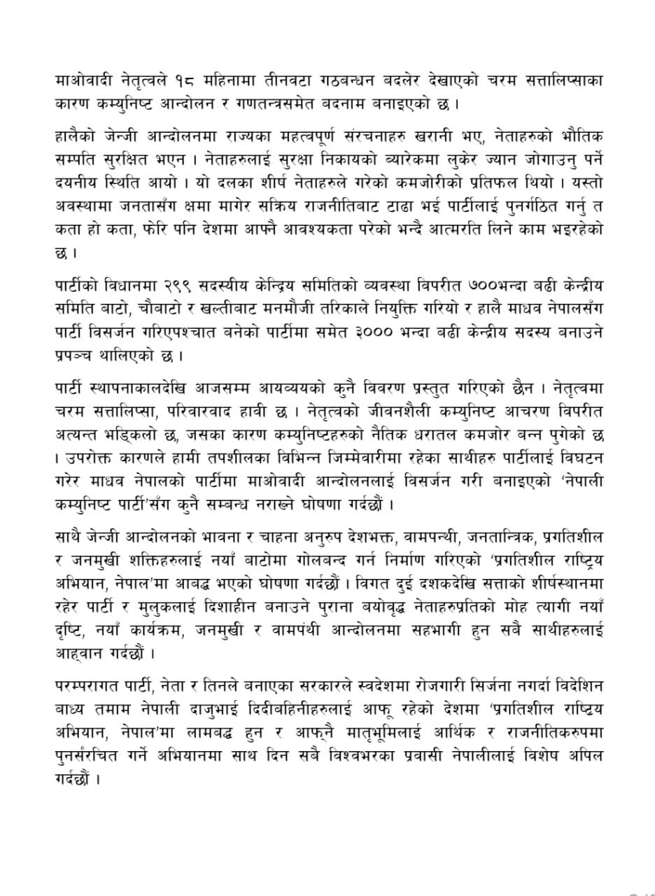 उनीहरुले एक विज्ञप्ति मार्फत जेन्जी आन्दोलनको भावना र चाहाना अनुरुप देशभक्त, वामपन्थी, जनतान्त्रिक, प्रगतिशिल र जनमुखी शक्तिहरुलाई नयाँ बाटोमा गोबन्द गर्न निमार्ण गरिएको प्रगतिशील राष्ट्रिय अभियान नेपालमा लामबद्ध हुन् अपिल गरेका छन् ।