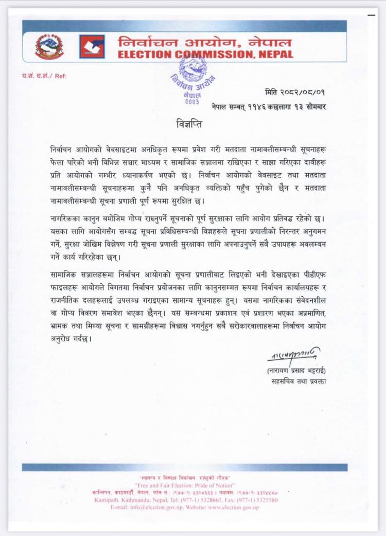 आयोगले विज्ञप्ति जारी गर्दै बेवसाइटमा अनाधिकृत रुपमा प्रवेश गरी मतदाता नामावलीसम्बन्धी सूचनाहरु फेला पारेको भनि विभिन्न सञ्चारमाध्यक र सामाजिक सञ्जालमा राखिएका र साझा गरिएको दाबीहरु प्रति गम्भीर ध्यानाकर्षण भएको जनाएको छ ।