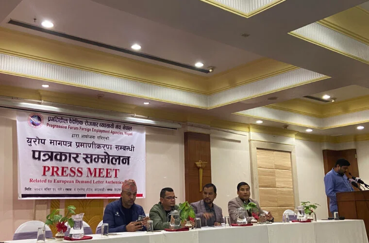 काठमाडौं । प्रगतिशील वैदेशिक रोजगार व्यवसायी मञ्चले सरकारद्वारा लामो समयदेखि रोकिएको युरोप मागपत्र प्रमाणीकरण खुलाउन माग गरेको छ । मञ्चले पत्रकार सम्मेलन गरी प्रमाणीकरण खुलाउन माग गरेको हो ।