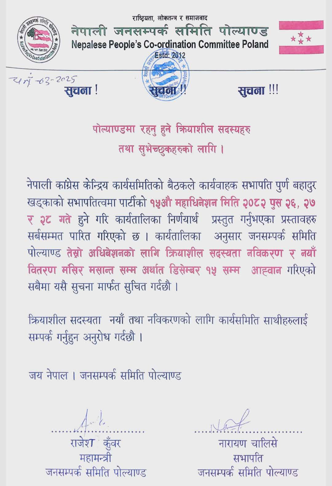 उक्त कार्यतालिका अनुसार जनसम्पर्क समिति पोल्याण्डको तेस्रो अधिवेशनका लागि क्रियाशील सदस्यता नवीकरण तथा नयाँ सदस्यता वितरण मंसिर मसान्तसम्म, अर्थात् डिसेम्बर १५ सम्मका लागि आह्वान गरिएको छ।
