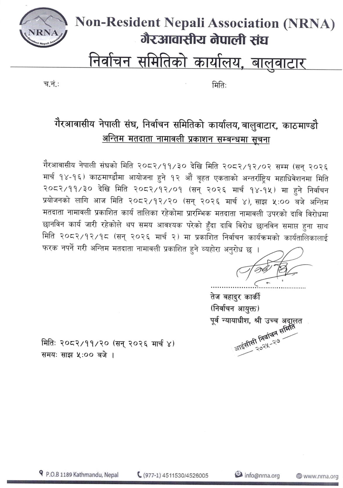 निर्वाचन समितिले बुधबार साँझ जारी गरेको विज्ञप्तिमा अन्तिम मतदाता नामावली प्रकाशनमा एक दिन ढिलाइ हुन सक्ने भए पनि यसअघि सार्वजनिक गरिएको निर्वाचन तालिकामा कुनै परिवर्तन नहुने स्पष्ट पारेको छ।