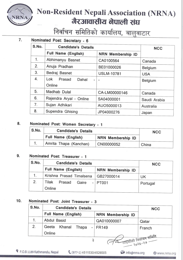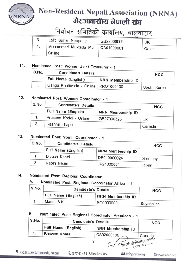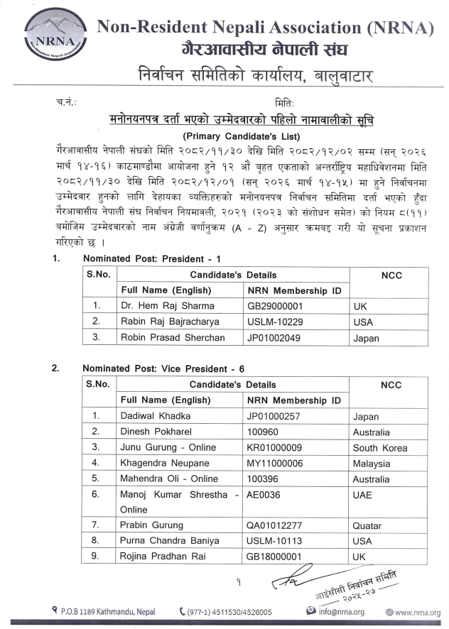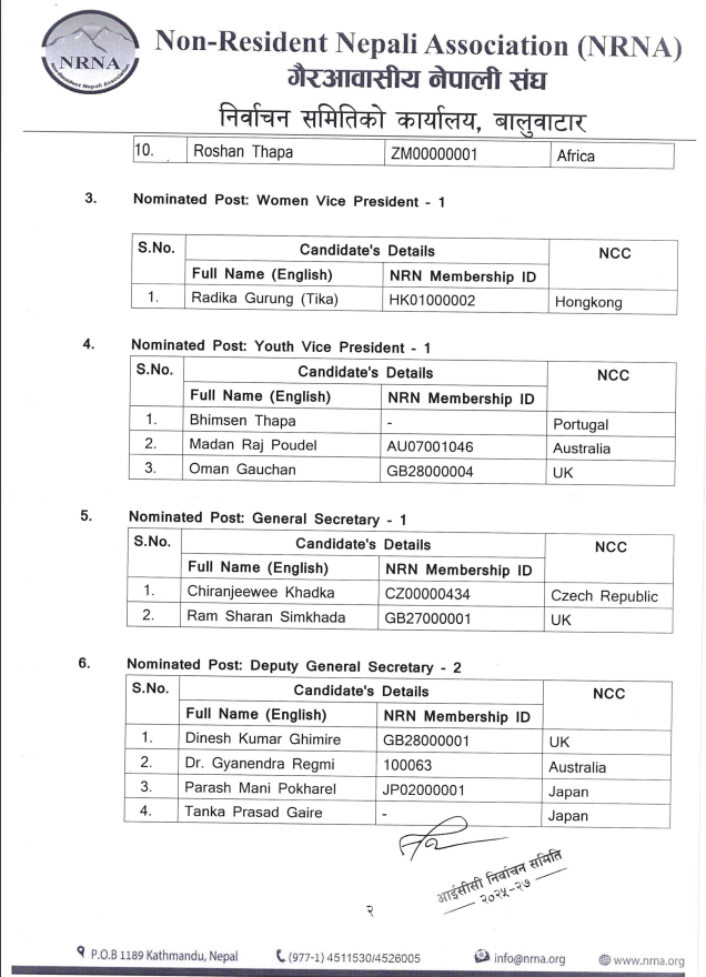 आगामी आइतबार हुने निर्वाचनका लागि बुधबार सम्पन्न मनोनयन दर्तामा डा. हेमराज शर्मा (यूके), रविन बज्राचार्य (अमेरिका) र रविन शेरचन (जापान) ले उम्मेदवारी दिएका हुन्।