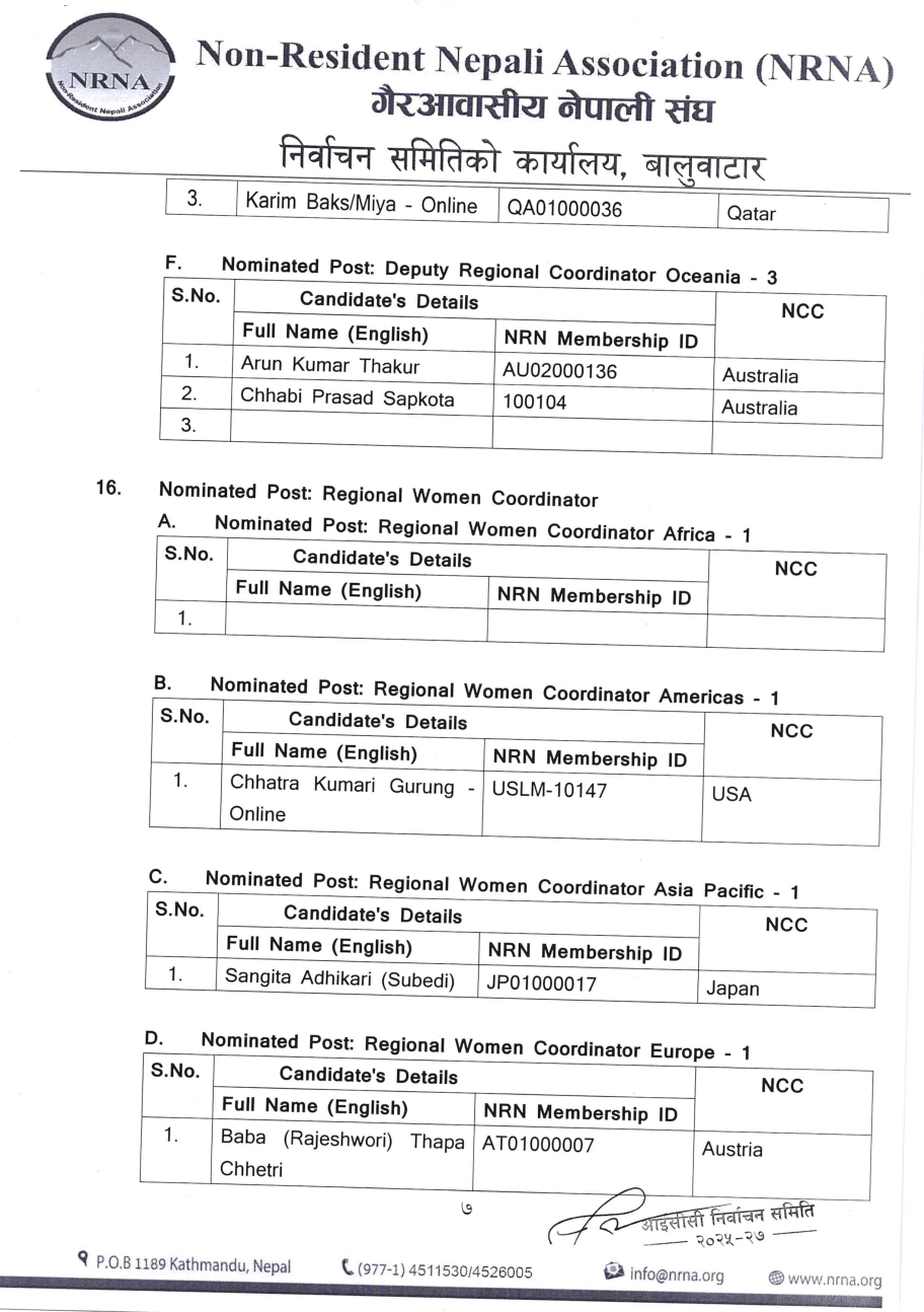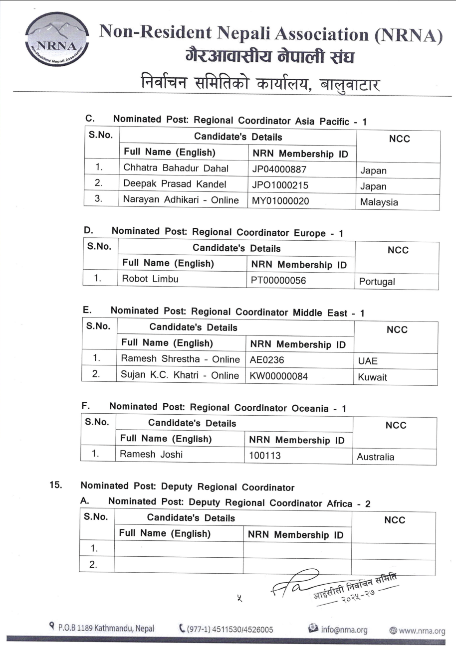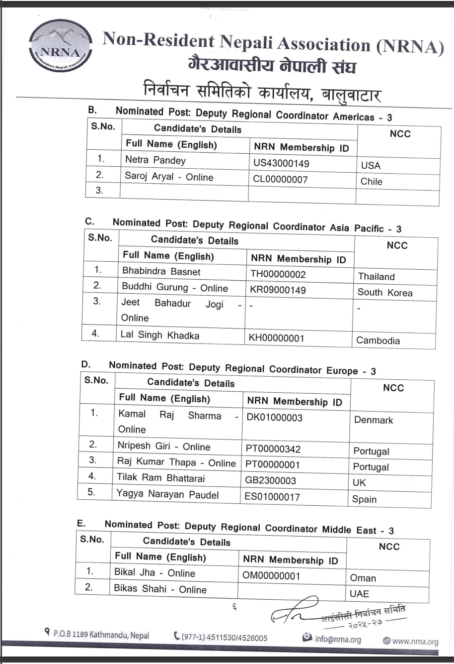 क्षेत्रीय संयोजकतर्फ अफ्रिका क्षेत्रबाट मनोज बिक र भुवन खरेल निर्विरोध भएका छन्। एसिया क्षेत्रको एक संयोजक पदका लागि तीन जनाको उम्मेदवारी परेको छ भने युरोप संयोजकमा रोबर्ट लिम्बु निर्विरोध भएका छन्। मध्यपूर्व संयोजक पदमा दुई जनाको उम्मेदवारी परेको छ।