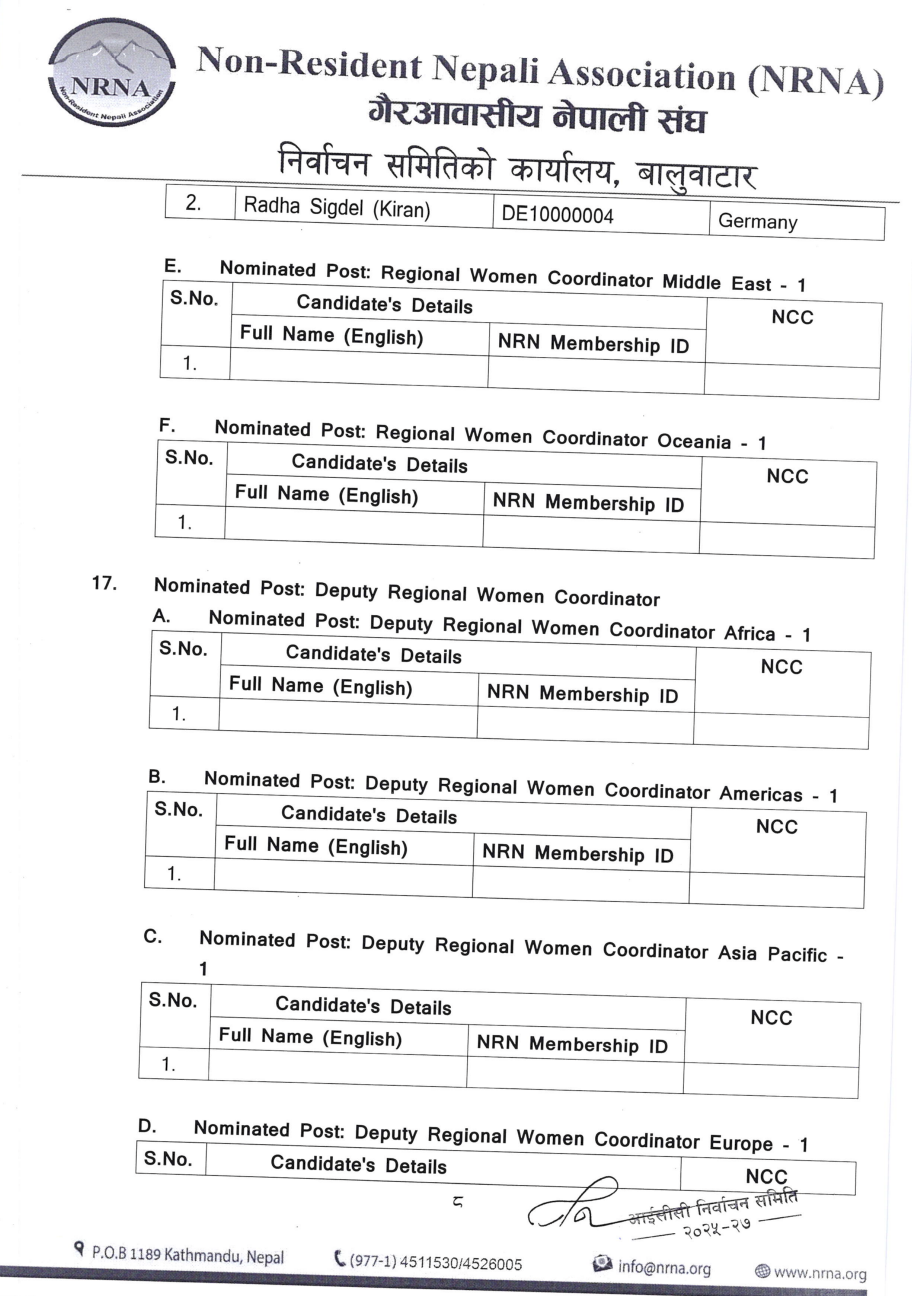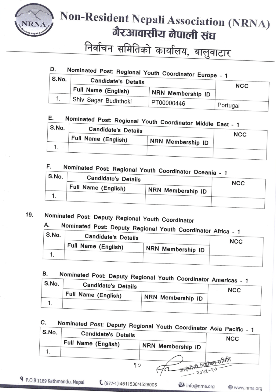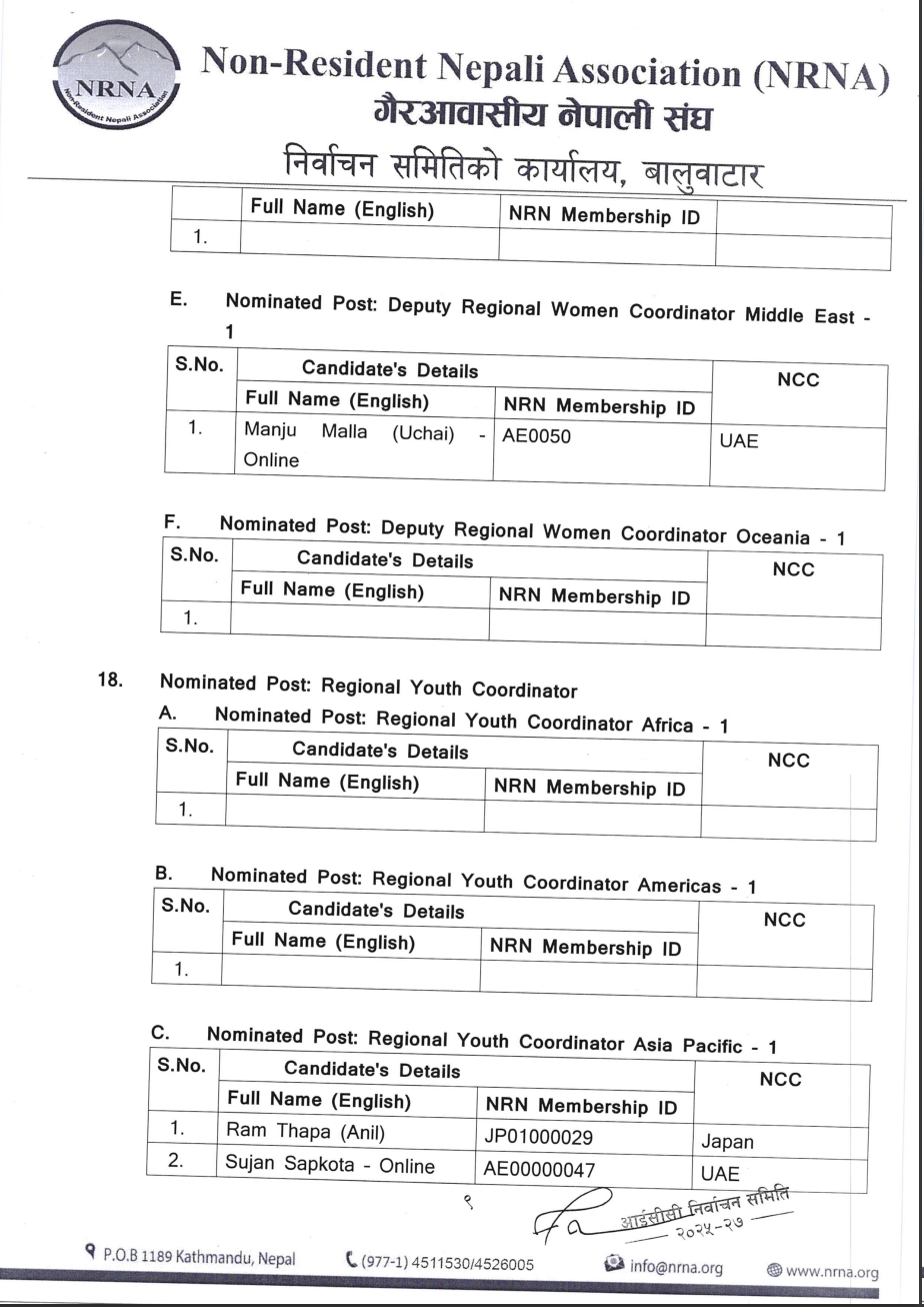 क्षेत्रीय संयोजकतर्फ अफ्रिका क्षेत्रबाट मनोज बिक र भुवन खरेल निर्विरोध भएका छन्। एसिया क्षेत्रको एक संयोजक पदका लागि तीन जनाको उम्मेदवारी परेको छ भने युरोप संयोजकमा रोबर्ट लिम्बु निर्विरोध भएका छन्। मध्यपूर्व संयोजक पदमा दुई जनाको उम्मेदवारी परेको छ।