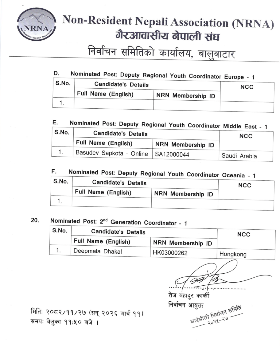 ओशियाना क्षेत्र संयोजकमा रमेश जोशी निर्विरोध भएका छन्। दोस्रो पुस्ता संयोजकमा दीपमाला ढकाल निर्विरोध भएकी छन्।