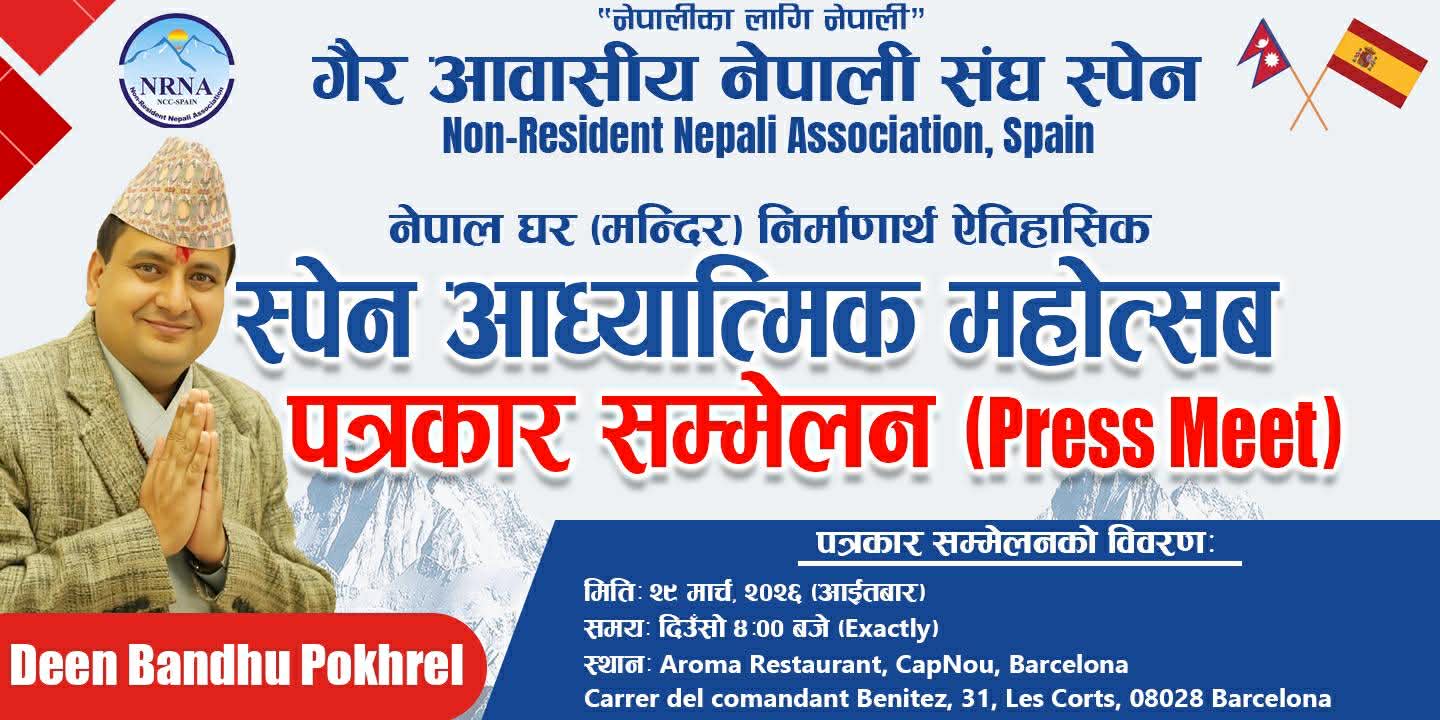 बार्सिलोना । स्पेन गैरआवासीय नेपाली संघ स्पेनले बार्सिलोनामा आफ्नै सामुदायिक भवन ‘नेपाल घर’ (मन्दिर) निर्माण गर्ने उद्देश्यका साथ आयोजना गर्न लागेको ‘ऐतिहासिक स्पेन आध्यात्मिक महोत्सव’ को तयारीका सन्दर्भमा सोमबार एक भव्य पत्रकार सम्मेलन सम्पन्न गरेको छ।