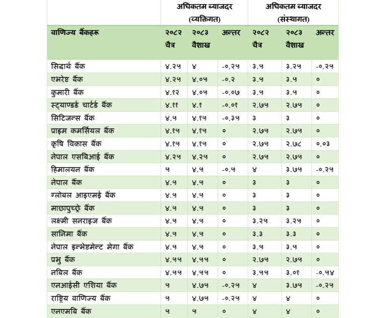 काठमाडौँ । वाणिज्य बैंकहरूले वैशाख महिनाका लागि ब्याजदर घटाएका छन् । वैशाख महिनाका लागि १० बैंकको ब्याजदर स्थिर छ ।