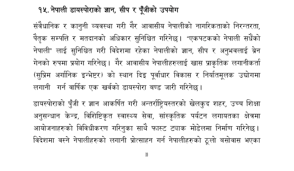 ‘एकपटकको नेपाली सधैंको नेपाली‘ लाई सुनिश्चित गरी विदेशमा रहेका नेपालीको ज्ञान, सीप र अनुभवलाई ब्रेन गेनको रुपमा प्रयोग गरिनेछ‘ मस्यौदामा छ ।