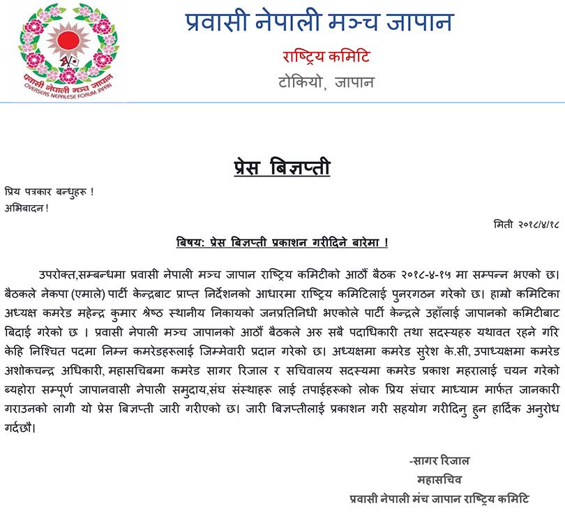 जापान । प्रवासी नेपाली मञ्च जापान राष्ट्रिय कमिटीको अध्यक्षमा सुरेश केसी अध्यक्षमा चयन भएका छन् ।