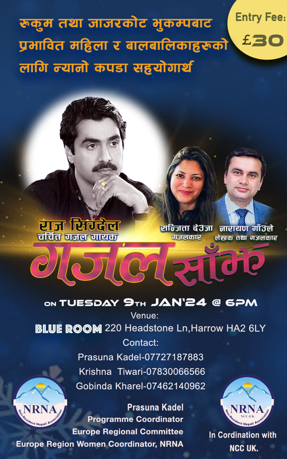 भूकम्प पीडितको सहयोगार्थ लण्डनमा गजल साँझ हुँदै