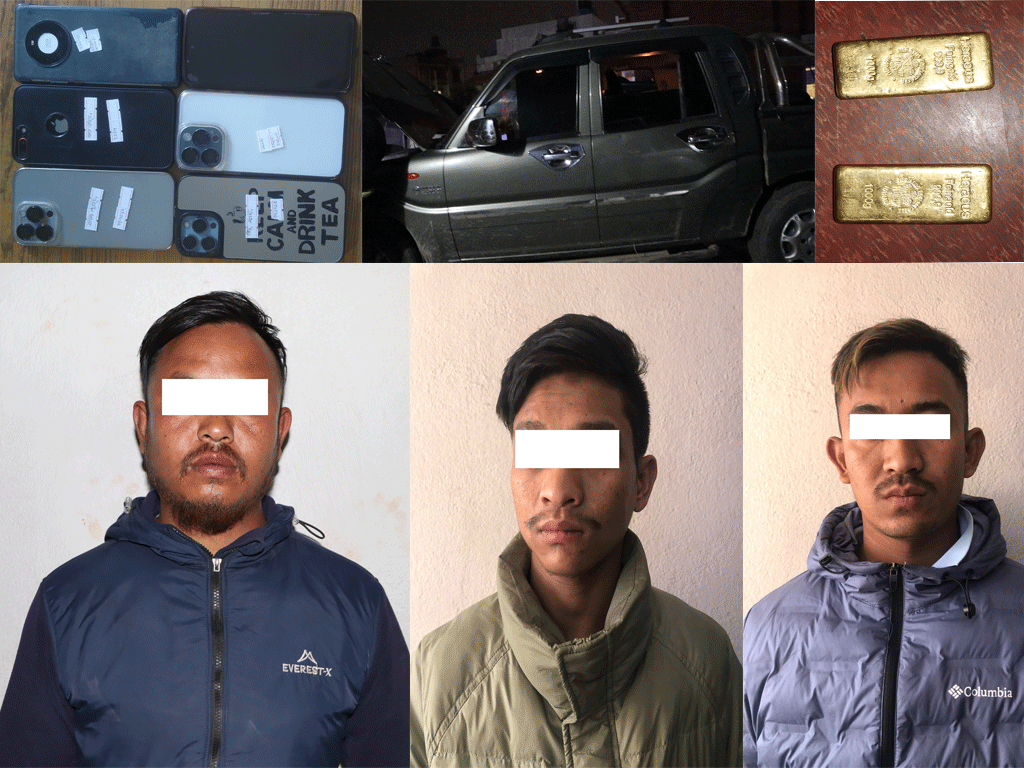 प्रहरीले सार्वजनिक गर्यो दुई किलो सुनसहित पक्राउ परेका अभियुक्त र गाडी