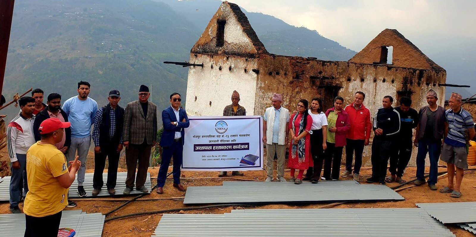 भोजपूर टक्सारका आगलागी पीडितलाई एनआरएनएद्वारा २५ बण्डल जस्तापाता वितरण