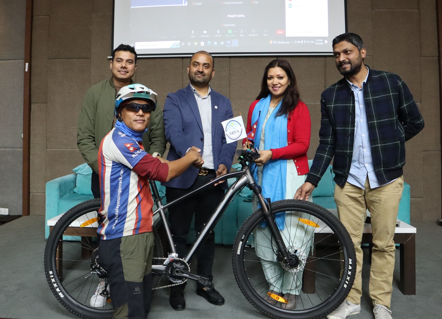 विश्व साईकलयात्री ज्ञान महर्जनलाई एनआरएनएद्धारा साईकल हस्तान्तरण